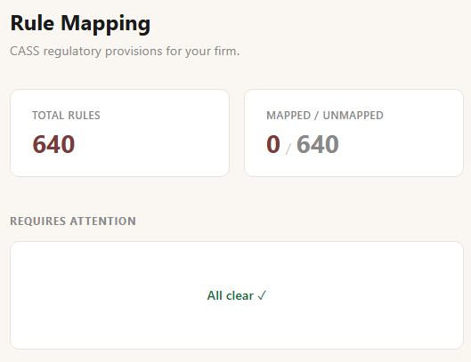 By starting out with rules and being able to demonstrate how they flow through to your controls, evidence and operations, ReguLore will become your one-stop shop for your CASS Oversight and more.